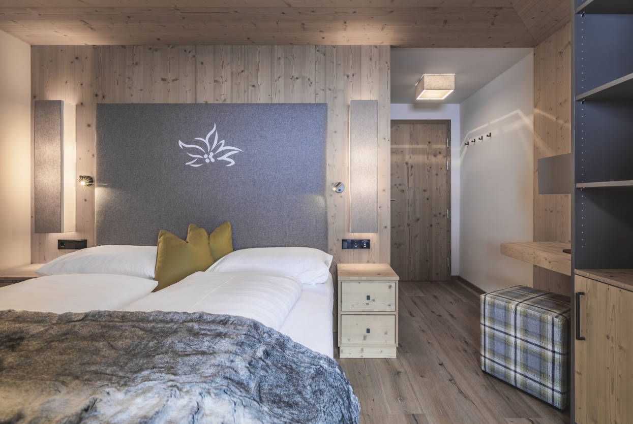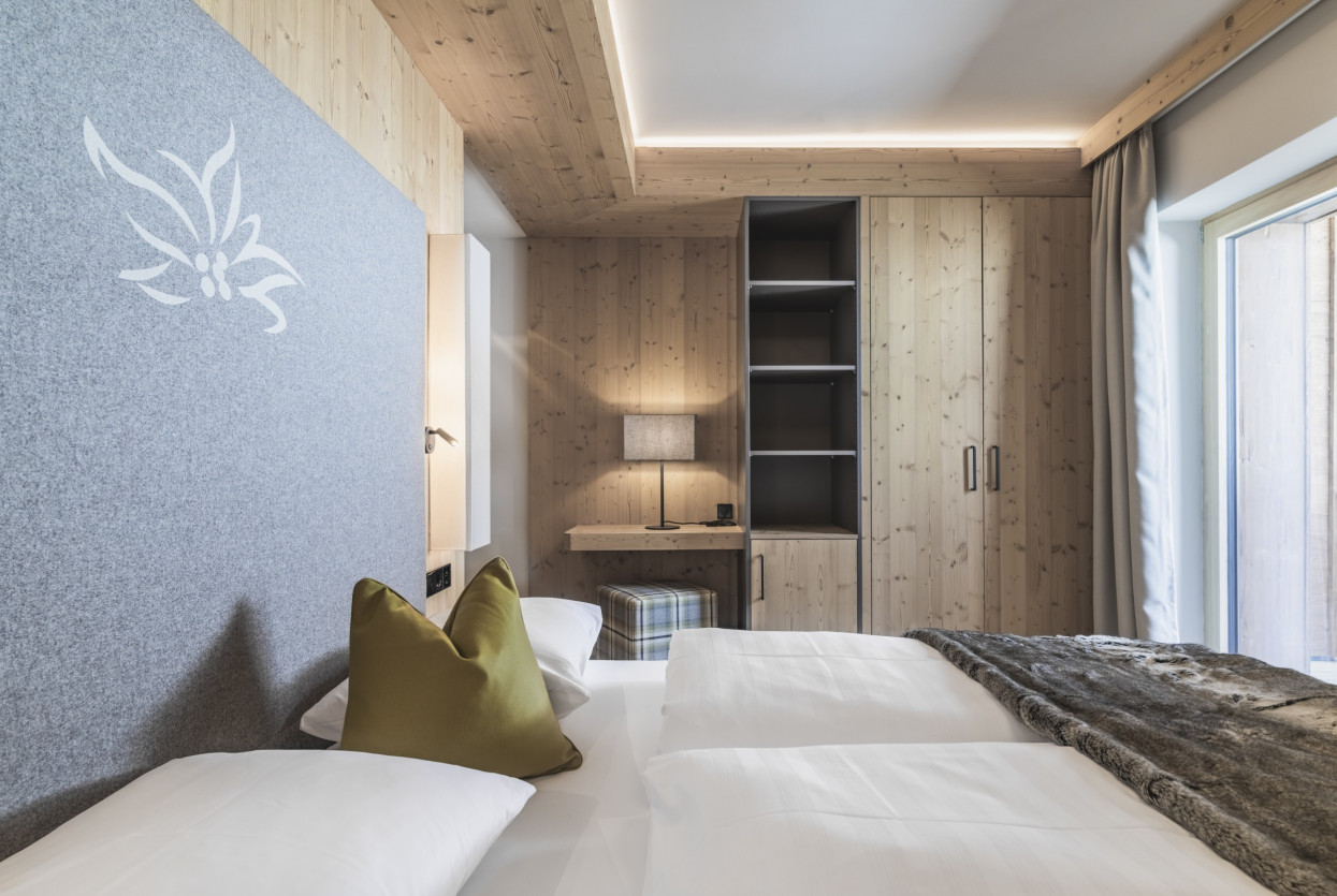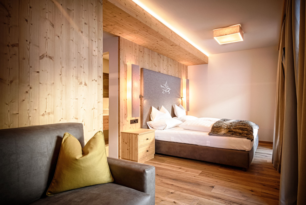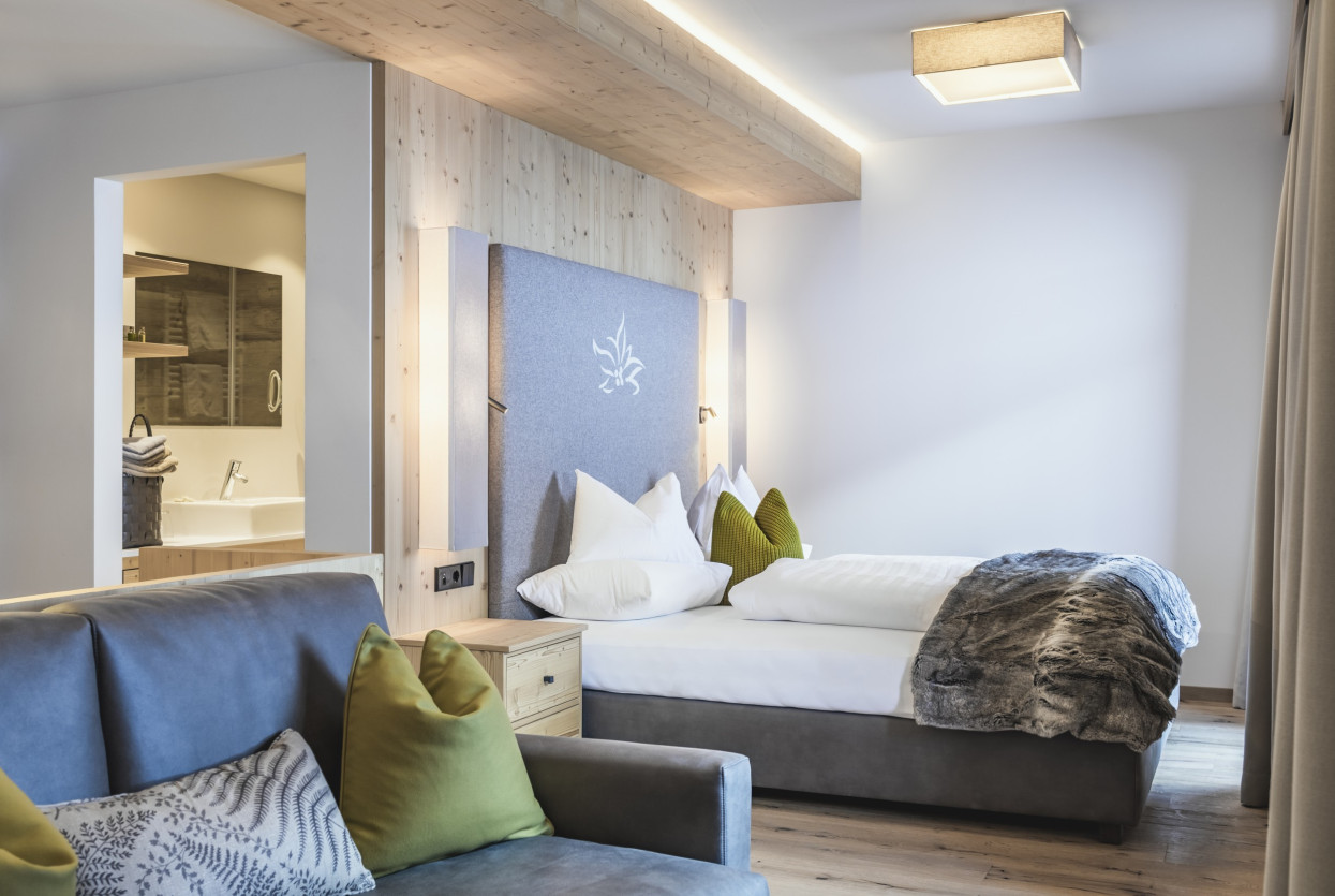 Relax di coppia e benessere nella nostra accogliente Suite Alpenrose. Che vi piaccia svegliarvi presto o dormire anche un pochino in più, la prima vista del mattino è direttamente sui pendii della Val Senales. È il modo perfetto per iniziare una giornata di vacanza nel cuore delle Alpi. Questa accogliente e moderna suite dispone di un balcone con sole mattutino e offre spazio per un massimo di 3 persone.